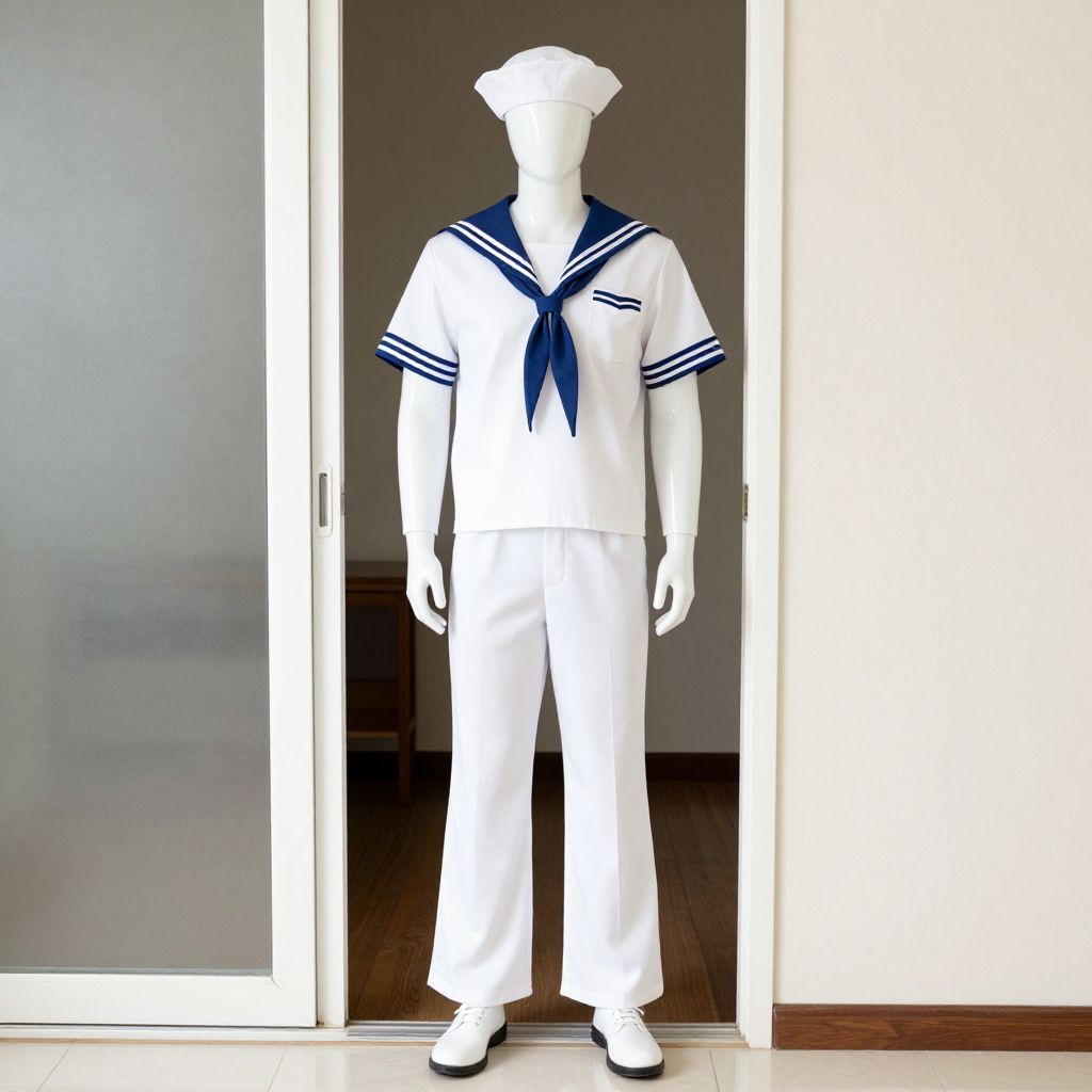 Adult Sailor Costume, sailor in a white uniform standing in a building