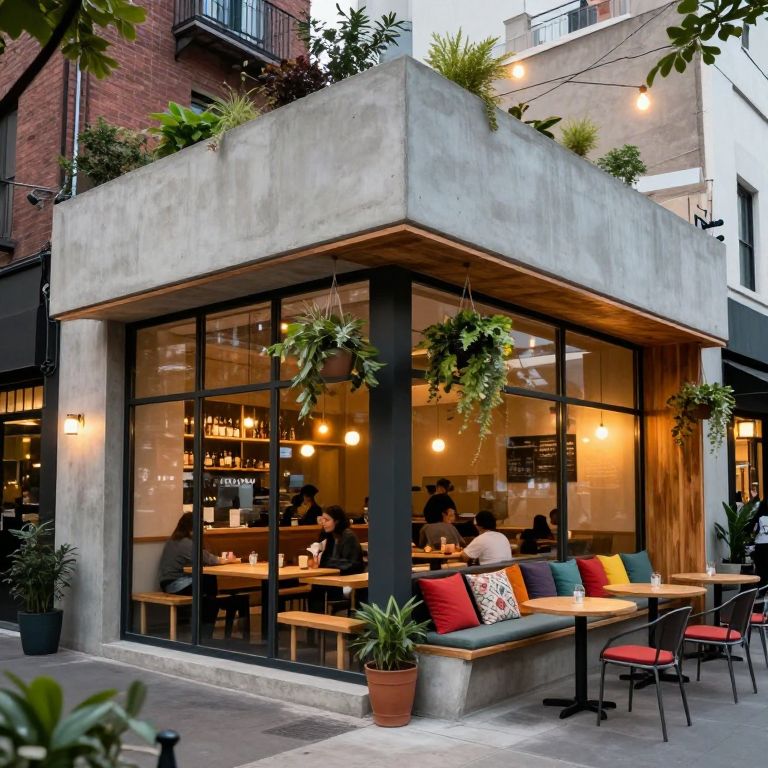 Modernista themed café exterior in a bustling city street, combining smooth concrete surfaces with large glass panels, warm wood accents, hanging plants, outdoor seating with colorful cushions, and a bustling atmosphere under string lights at twilight.