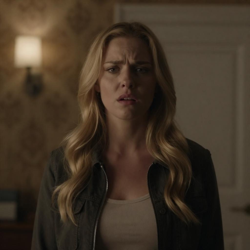 Photograph of a blonde woman with long, wavy hair, wearing a dark jacket over a beige top, looking worried. Dimly lit room with patterned wallpaper and a lit wall sconce in the background. Blurred door in the background. She has a slightly open mouth and furrowed brows.