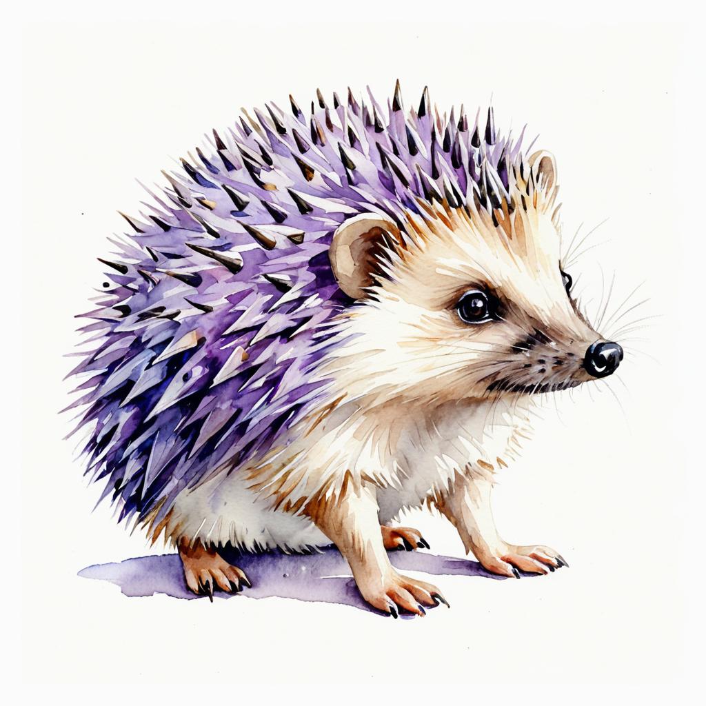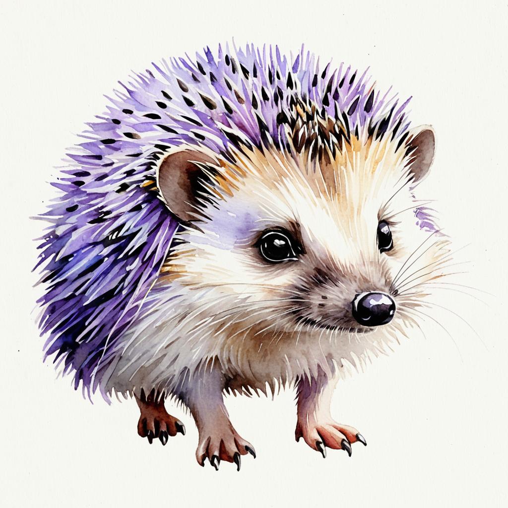 Hand-drawn watercolor illustration of a cute hedgehog with soft lavender spines and a muted brown body. The hedgehog has expressive black eyes and small paws, set against a plain white background, showcasing a blend of simplicity and artistic charm.