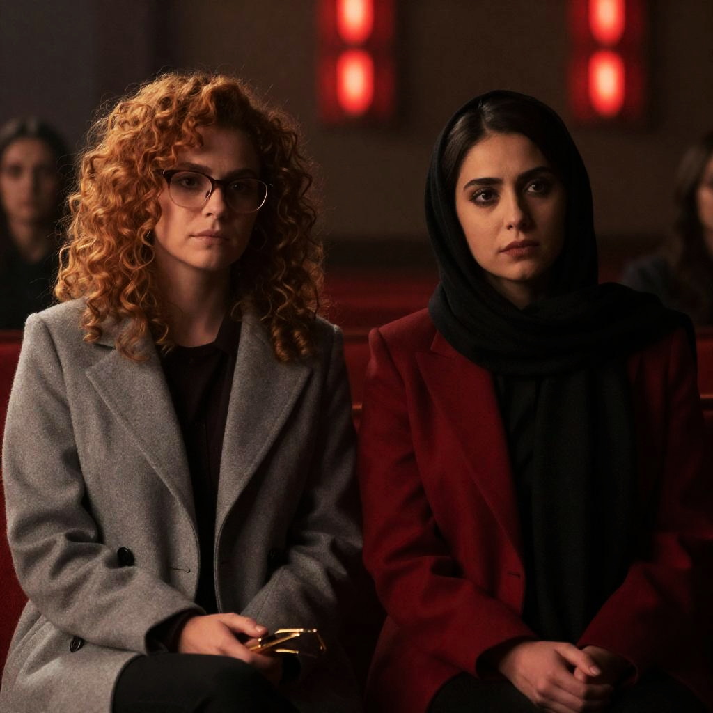 Photograph of three people indoors. Middle-aged man with white beard, grey headwrap, white shirt, intense expression, stands between two women. Woman on left has long dark hair, neutral expression. Woman on right has curly blonde hair, brown coat, intense gaze, holds man's hands. Background includes window with green frame.