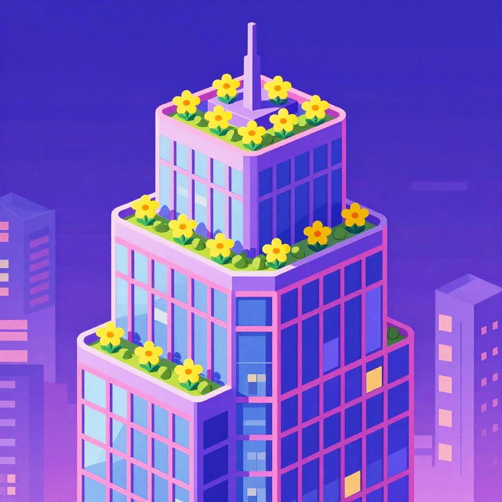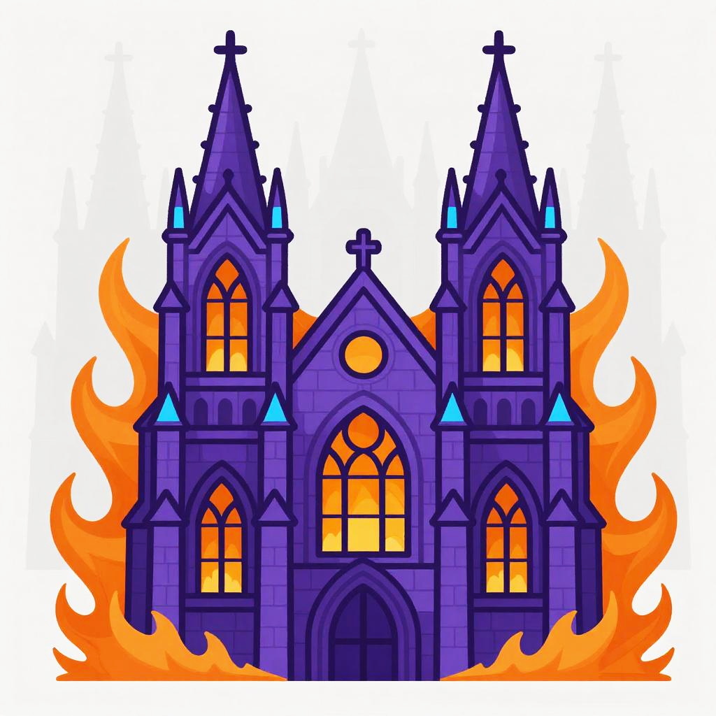 Vibrant digital drawing of a lively, cartoonish Gothic cathedral. Emphasize a lively, cartoonish composition with clean outlines, bold shapes, and cheerful energy throughout. The structure should feature deep purple stone walls with bright orange stained glass windows, towering pointed spires trimmed with electric blue accents. Apply dramatic complementary colors with bold flame-like patterns on a light gray misty background, maintaining high contrast and a sense of fun.