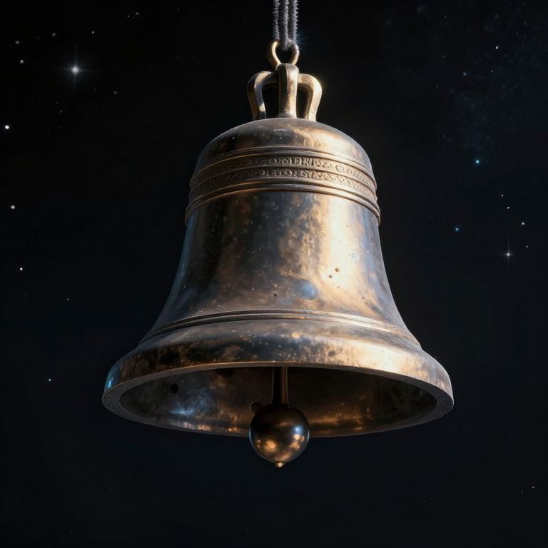 Photograph of a large, metallic bell hanging against a dark, starry night sky. The bell is silver with a slightly tarnished, reflective surface, featuring intricate engravings near the top. A small, spherical clapper hangs beneath the bell's lip. The bell is suspended by a black, metal chain, and the starry background adds a cosmic, serene atmosphere. The bell's texture is smooth with subtle wear, and the lighting highlights its metallic sheen, creating a sense of depth and realism.