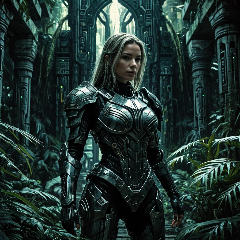 Heroic portrait of cybernetic female knight in futuristic armor exploring an ancient overgrown jungle temple with glowing runes, rendered with dramatic chiaroscuro and moody colors, painterly technique inspired by H.R. Giger, hyper-detailed cinematic concept art.