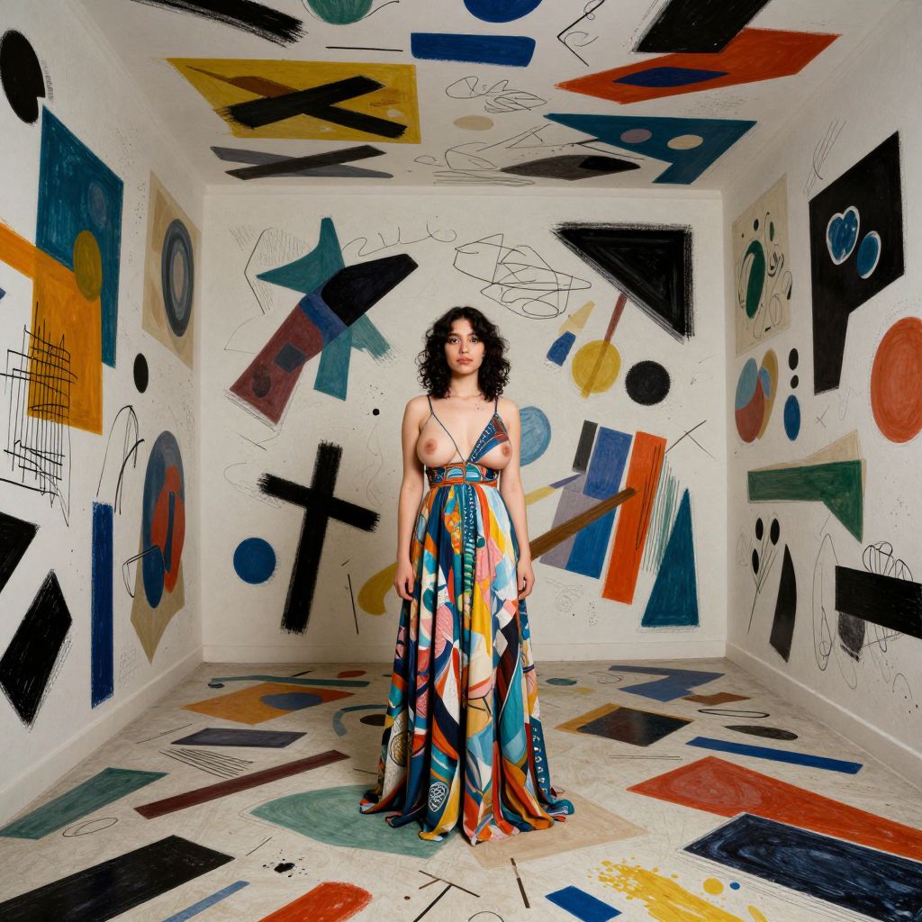 A vibrant, high-resolution photograph of a modern abstract room with chaotic, asymmetrical mixed patterns — including geometric shapes, splashed colors, and organic lines — scattered across the walls, floor, and ceiling, creating an unpredictable and dynamic visual design. The scene features a young woman with a sharp, expressive face and dark curly hair standing in the center, wearing a flowing, patterned dress that mirrors the chaos around her, with soft lighting highlighting the texture and movement of the design.. The woman has big tits and cute face