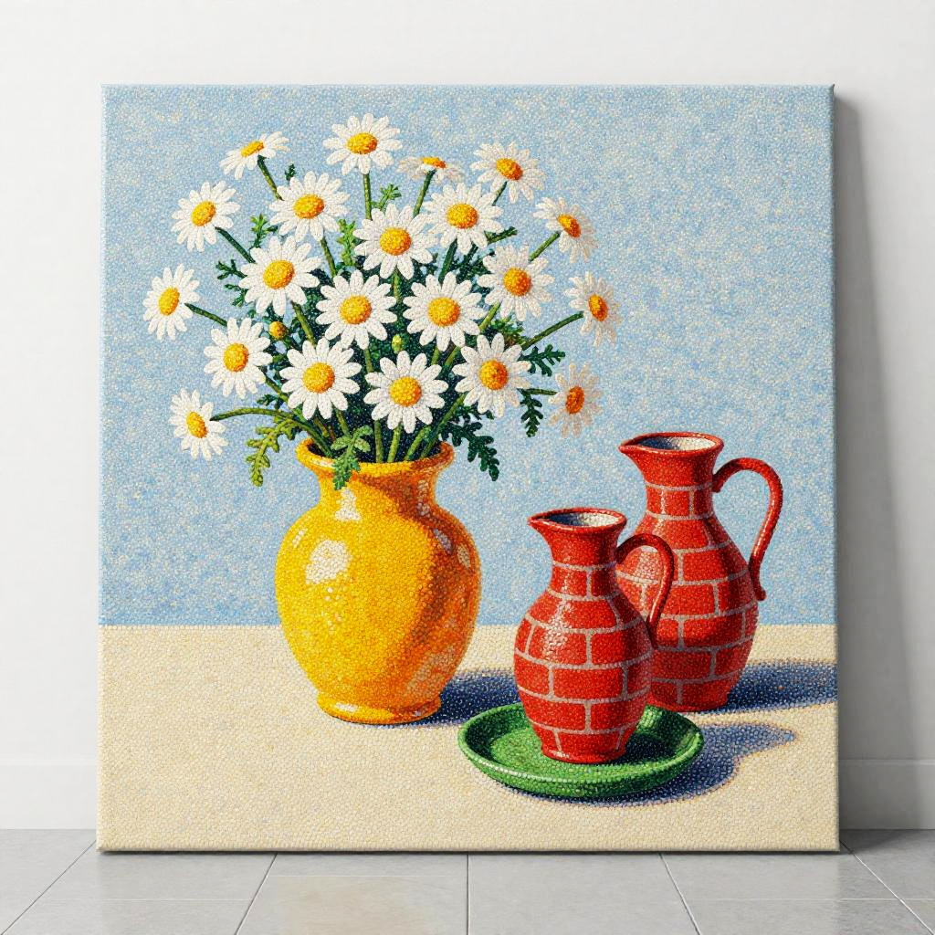 A pointillism painting with small dot texture of white daisies in a glossy marigold container alongside red brick-patterned jugs and moss-green saucers. Set against subtle dot clusters creating shaded gradients in pale blue and cream on a tiled floor. Playful modern still life, Memphis-inspired geometry, saturated yet balanced color, clean negative space, high detail, crisp edges, soft studio lighting, cohesive composition.