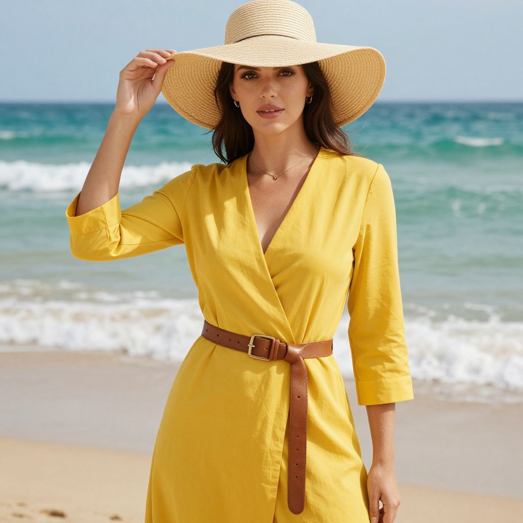 Woman wearing a vibrant golden yellow wrap dress cinched with a brown leather belt and accessorized with a wide-brimmed straw hat, embodying the perfect beach ensemble against a backdrop of turquoise waves and sandy shores.