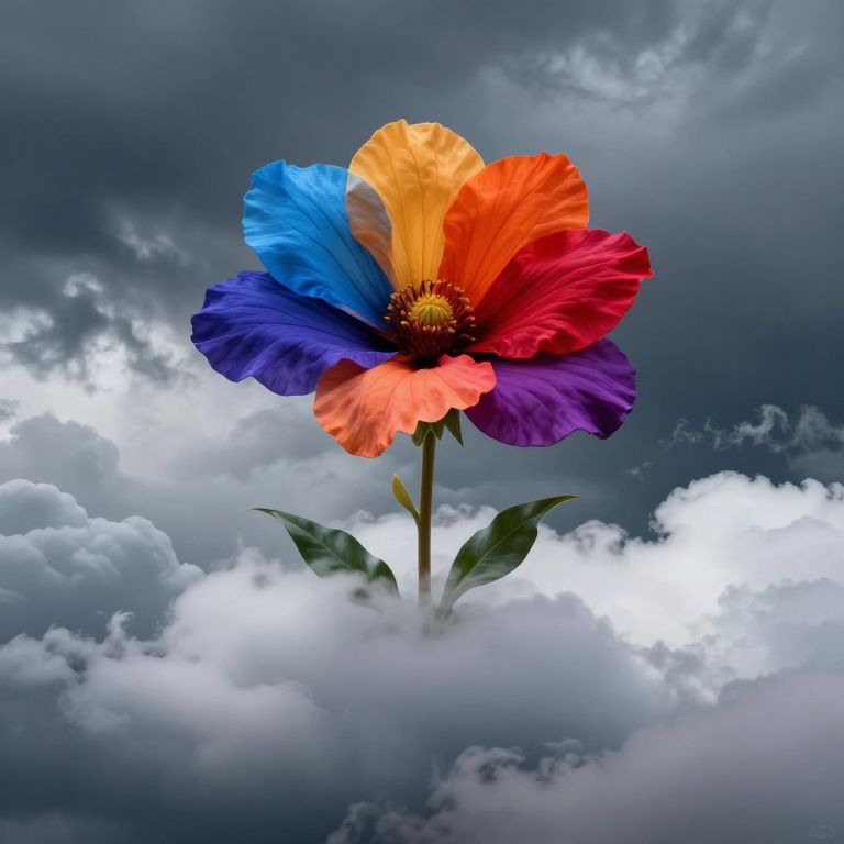 The image presents a striking and surreal scene where a vibrant, multi-colored flower emerges from the clouds. The flower, with its petals in shades of blue, orange, red, and purple, stands out against the dark, stormy sky. The petals are large and expansive, creating a sense of depth and dimension. The flower's stem and leaves are delicate and green, contrasting with the bold colors of the petals. The clouds, in various shades of gray and white, form a dramatic backdrop, with some clouds appearing to be in motion, adding a dynamic element to the composition. The overall scene is a blend of natural beauty and artistic fantasy, with the flower seemingly growing up from the clouds, symbolizing a connection between the earth and the heavens.
