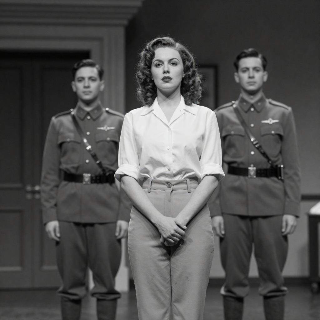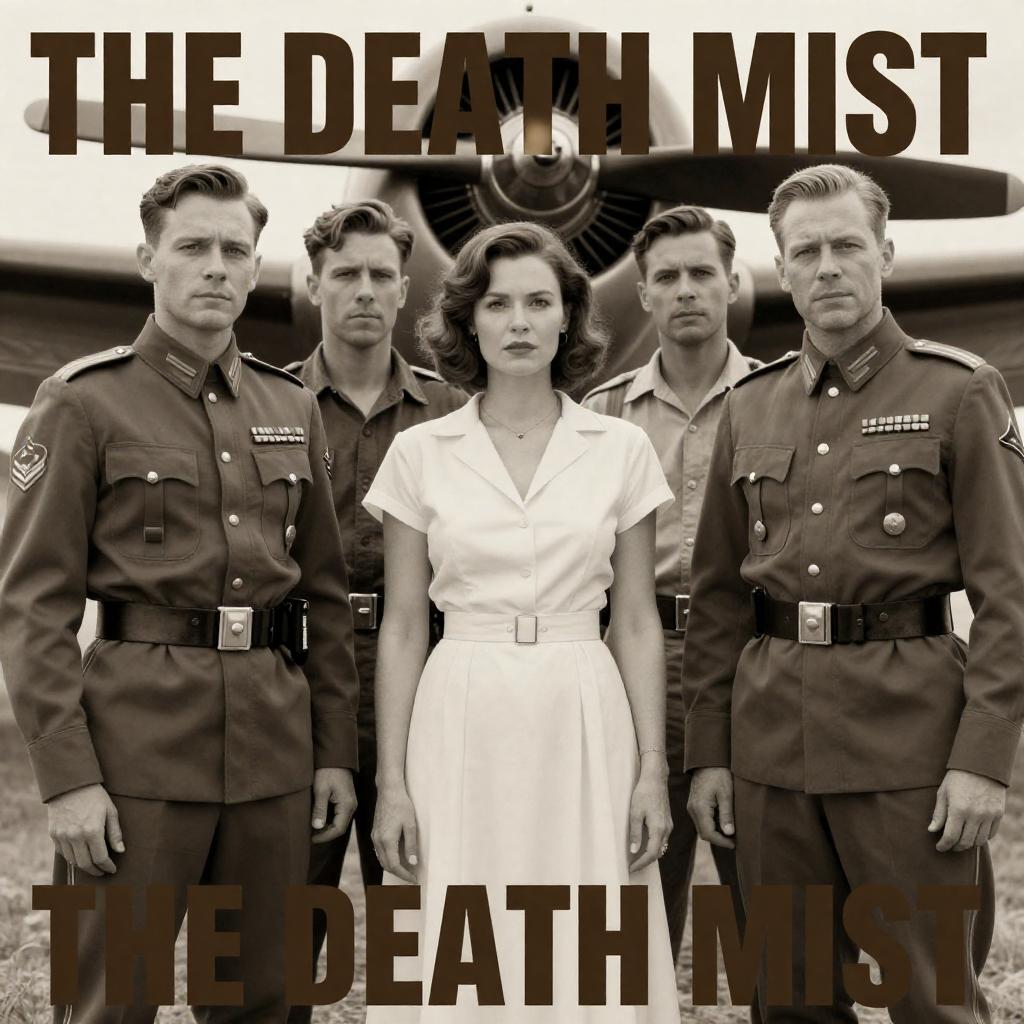 Sepia-toned movie poster for "The Death Mist" featuring five people. A woman in a white dress stands center, flanked by four men in military-style uniforms with medals. Background shows a large aircraft propeller. Bold at top and bottom. The men have varied haircuts and expressions, with one man slightly behind the group.