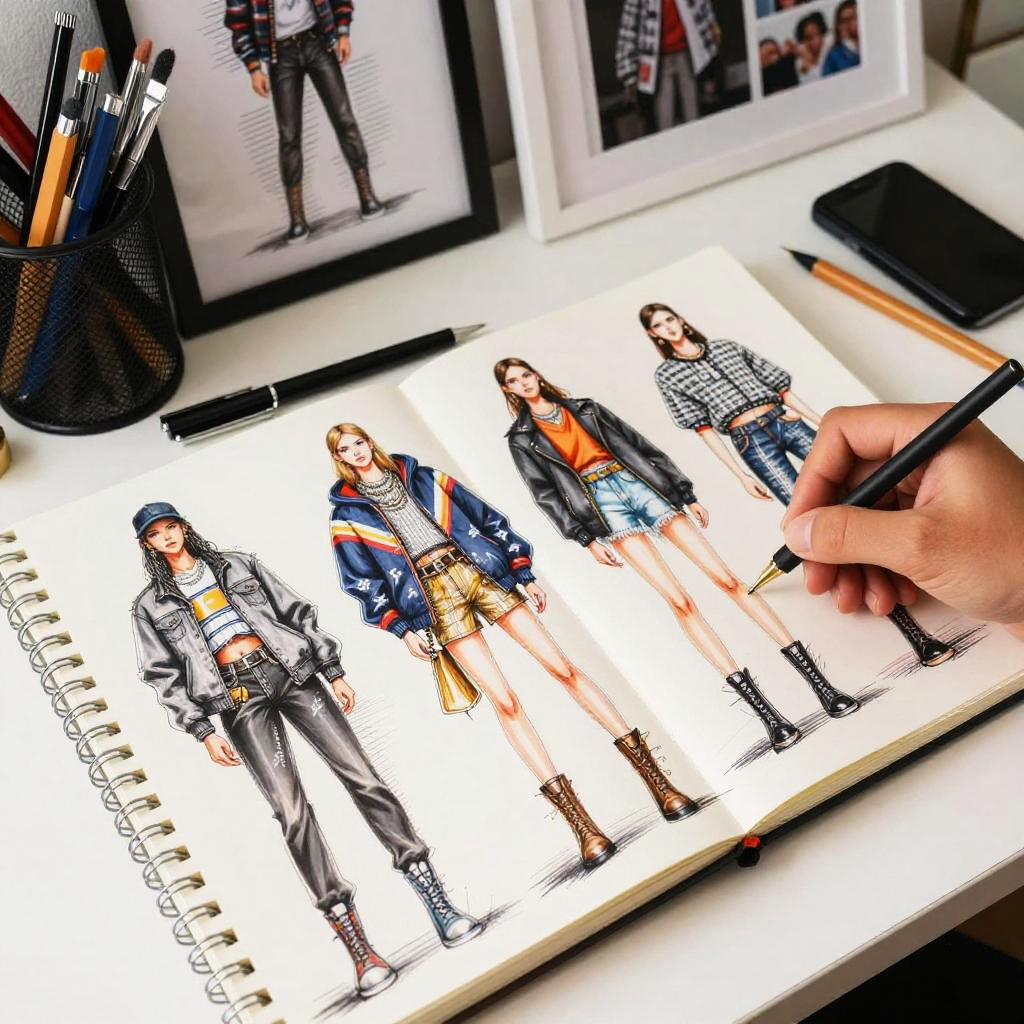 Sketch fashion designer drawing intricate fashion illustrations, combining urban streetwear and haute couture in a stylish sketchbook, with hand-drawn patterns, detailed textures, and a vibrant, modern workspace filled with inspirational mood boards.