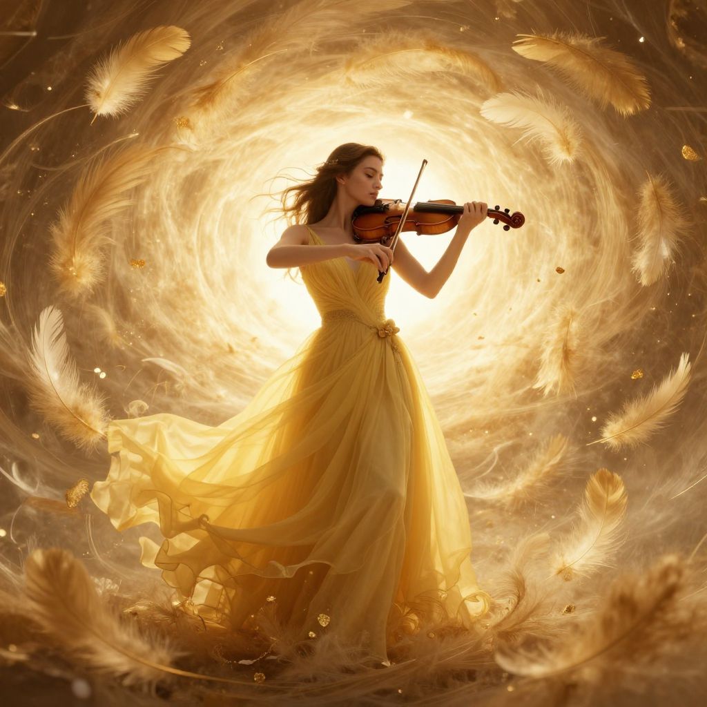 A ethereal digital artwork depicts a woman in a flowing yellow gown playing a violin amidst a swirling vortex of golden feathers, illuminated by a radiant golden hour light that casts a dreamlike, otherworldly ambiance.