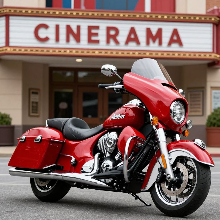 Photograph of a shiny red Harley-Davidson motorcycle parked in front of a vintage-style cinema marquee with bold white and red letters. The motorcycle features chrome accents, a large windshield, black leather seat, and elongated saddlebags. The background includes a beige building with windows and a maroon trim, potted plants on either side of the entrance, and a classic marquee sign. The motorcycle's design includes intricate detailing and a polished finish, highlighting its sleek and powerful aesthetic. The street is paved and appears to be in an urban setting.