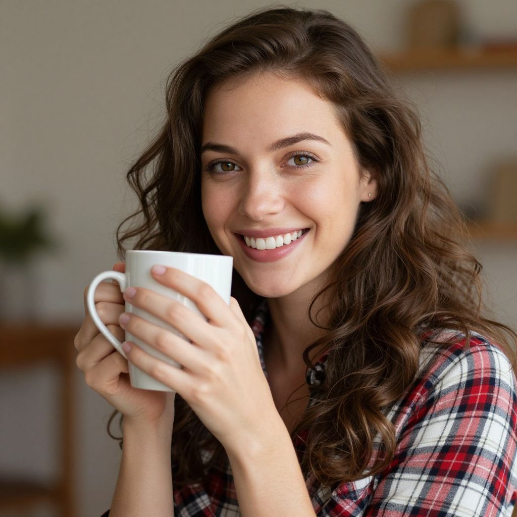 Photograph of a smiling woman with long, wavy brown hair and fair skin, holding a white mug close to her face. She's wearing a red and white plaid shirt. The background is softly blurred, featuring warm indoor lighting and some indistinct furniture. She looks happy and relaxed, with natural light highlighting her cheerful expression. The overall feel is cozy and inviting.