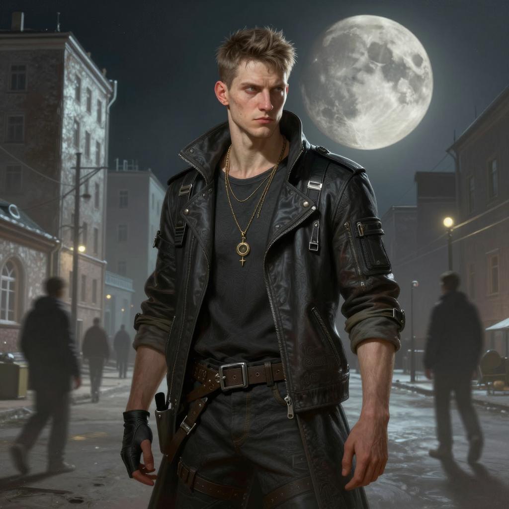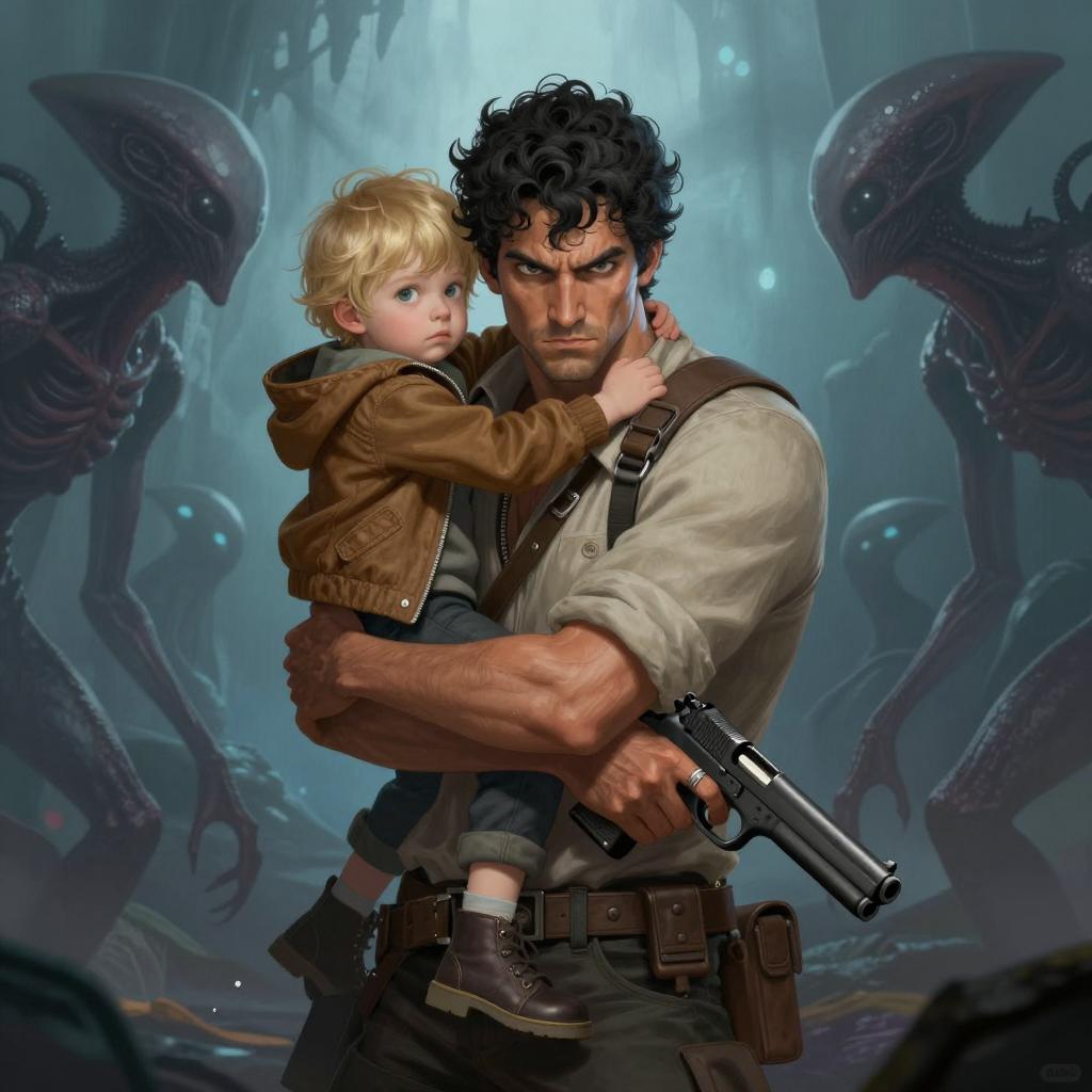 Digital illustration of a man with curly black hair and a beige shirt, holding a gun, carrying a blonde child in a brown jacket. Both have intense expressions. Surrounding them are dark, alien-like creatures with elongated heads. The background is a blue, cave-like environment with glowing light. The man is in a defensive stance, with creatures on both sides. The child is clutched tightly around the man's neck. The illustration uses a realistic style with detailed ures and lighting.