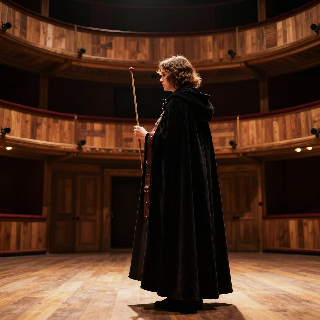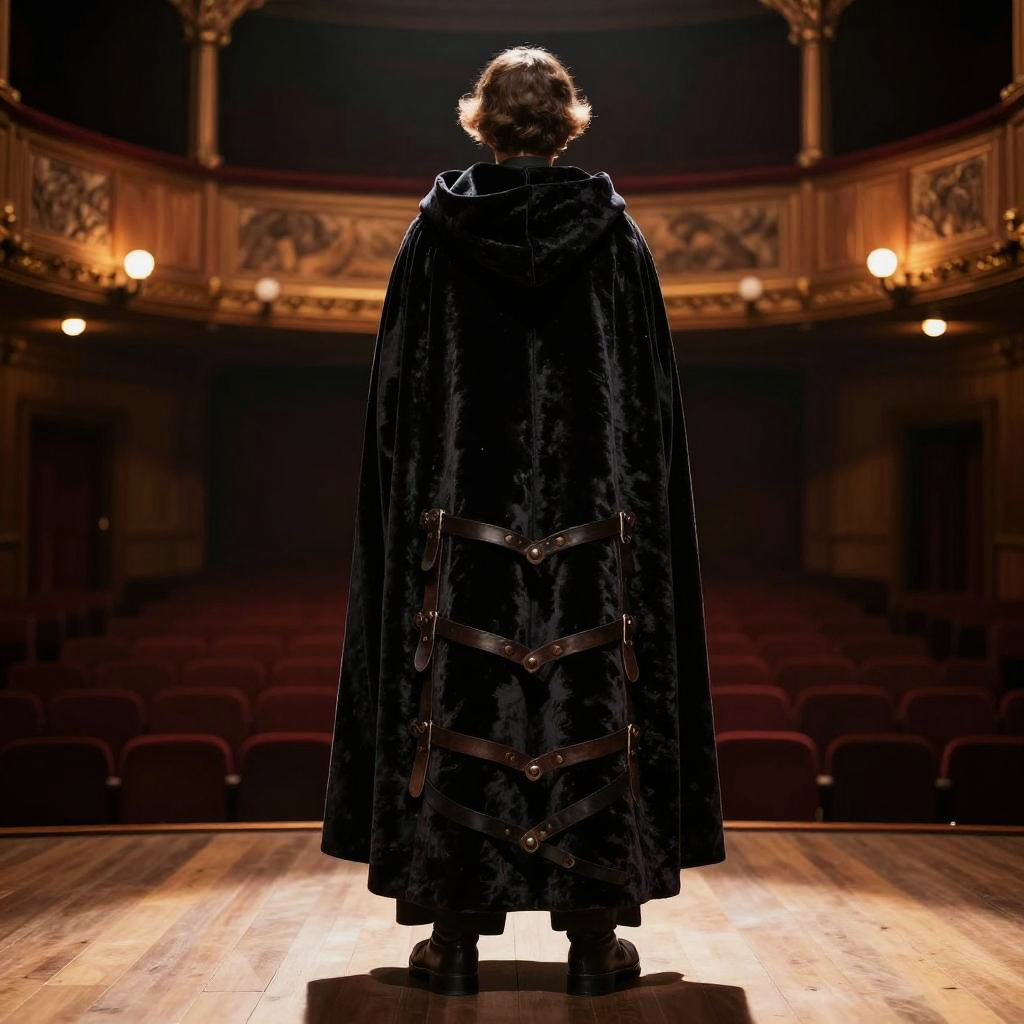 A shadow puppeteer wearing a dark velvet cloak with leather straps stands on a wooden floor in a dimly lit, intimate wooden theater. The individual has wavy hair and is holding a puppet control stick, with the warm lighting highlighting the texture of the cloak and the detailed wooden interior of the theater.