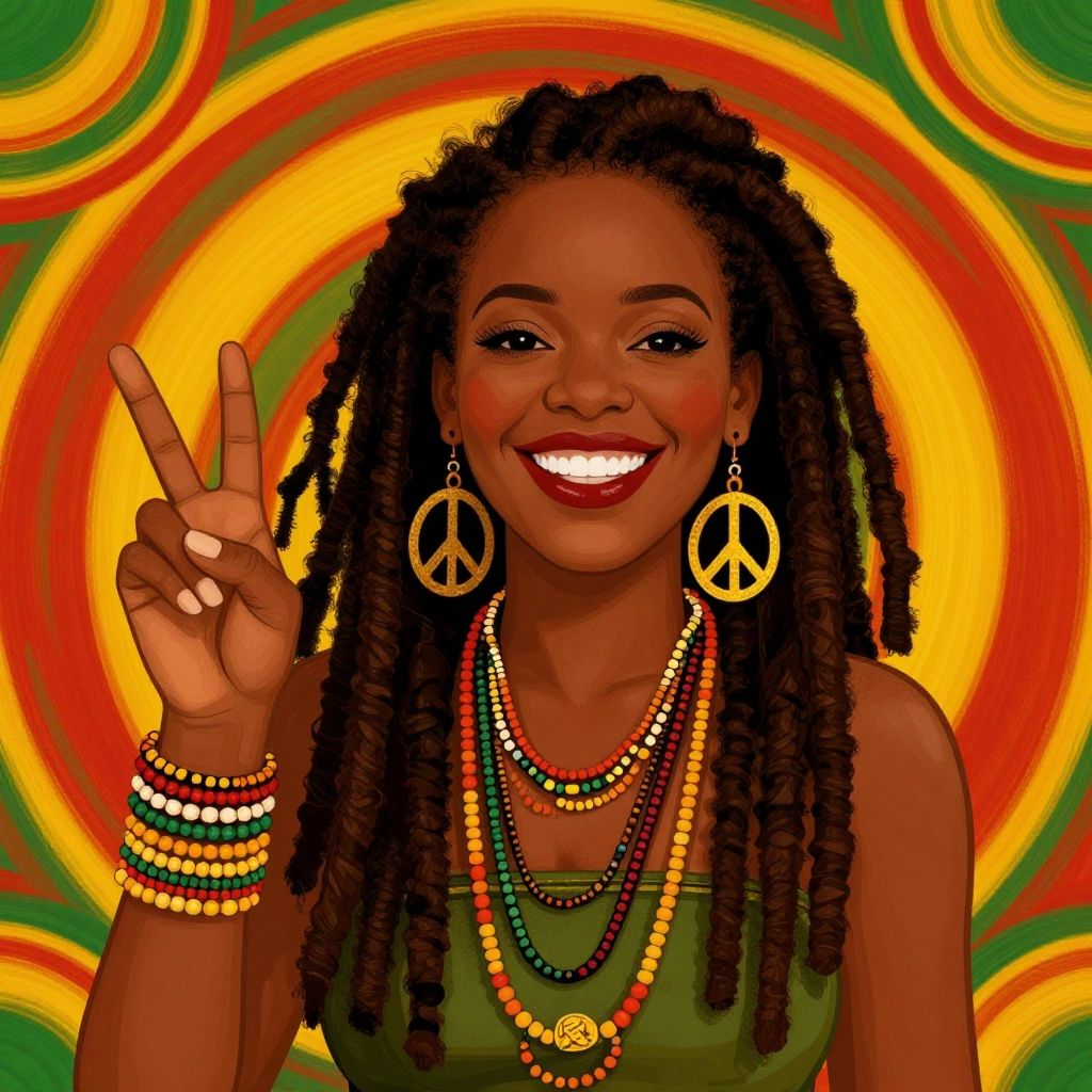 Illustration of a joyful Rastafarian woman with long dreadlocks, wearing colorful beaded necklaces, bracelets, and large peace sign earrings. She is posing with a peace hand gesture against a vibrant background with red, yellow, and green circular patterns, symbolic of Rastafarian culture.