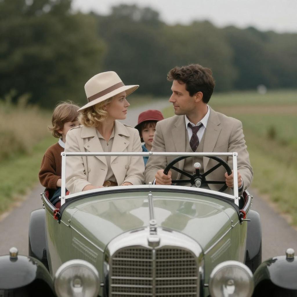 Photograph of a vintage car with four people. A dark-haired man in a beige suit drives, looking at a blonde woman in a cream-colored hat and jacket. Two children, one in a brown sweater and the other in a red hat, sit in the back. The car is on a grassy road with a forest background.
