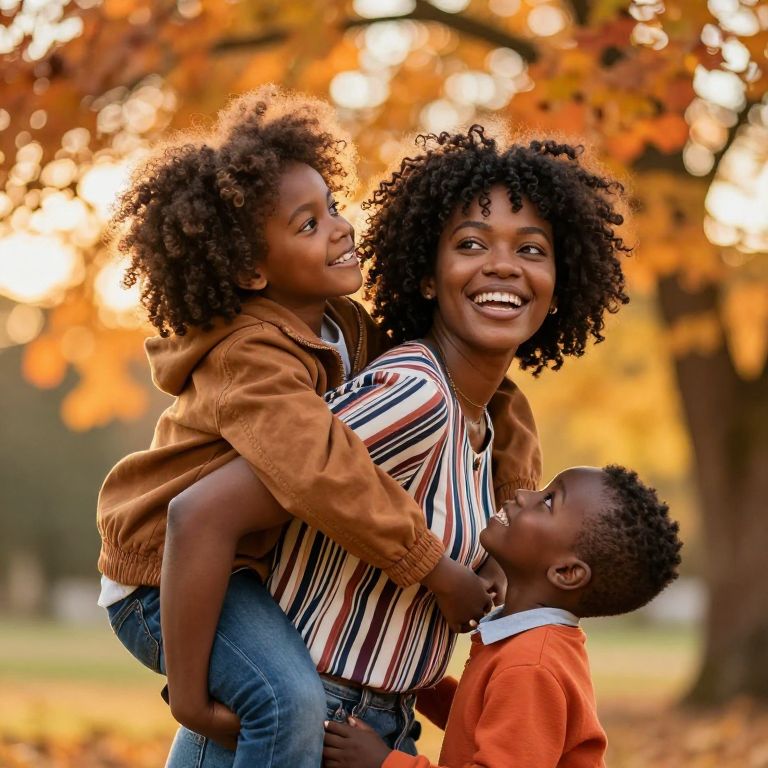 Photograph of a joyful African-American family in an autumn park. The mother, with dark skin and natural curly hair, wears a striped shirt under a brown jacket, smiling broadly. She carries a young boy with curly hair in a brown jacket, who looks up at her with a smile. Another young boy with short curly hair, wearing an orange sweater, looks up at her while standing close. The background features blurred, colorful autumn leaves and trees, with sunlight filtering through, creating a warm, vibrant atmosphere.