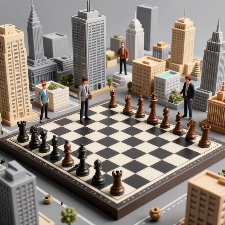 A chessboard city where buildings shift positions mid-game, following charismatic players who unknowingly pilot wandering districts.