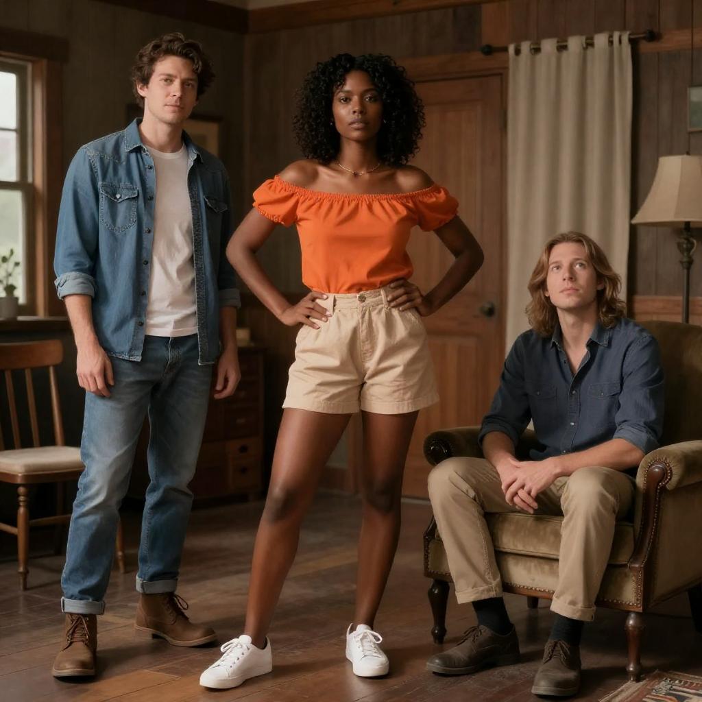 An African-American woman with curly hair sits on a director's chair wearing a black-and-white checkered off-shoulder top and blue jeans with an intense expression. To her left, an Asian man in a black suit stands with a neutral expression. To her right, a blonde woman wearing a blue striped shirt and green pants reads from a script. The scene is set in a professional photo studio with lighting equipment and white walls in the background.