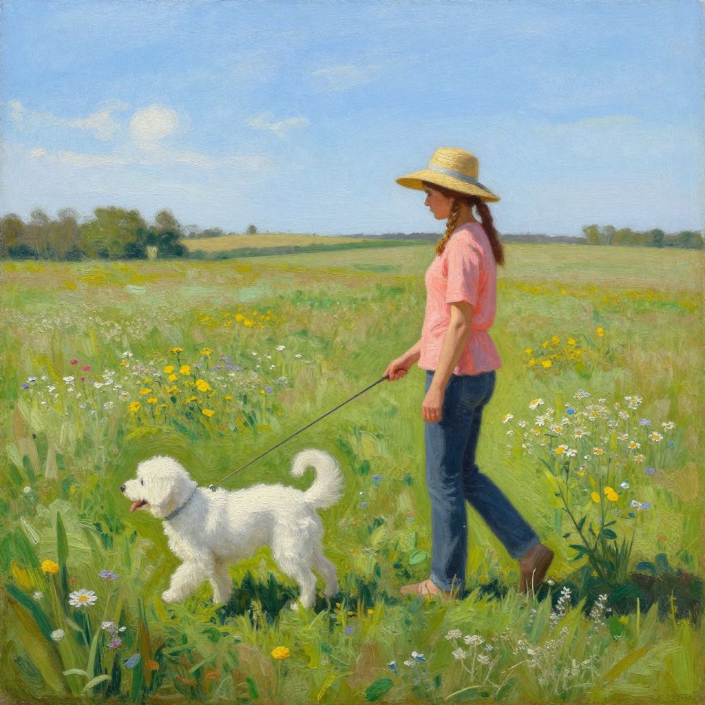 Digital painting of a woman in a straw hat, pink shirt, and blue jeans, walking a white fluffy dog in a sunny meadow with yellow and