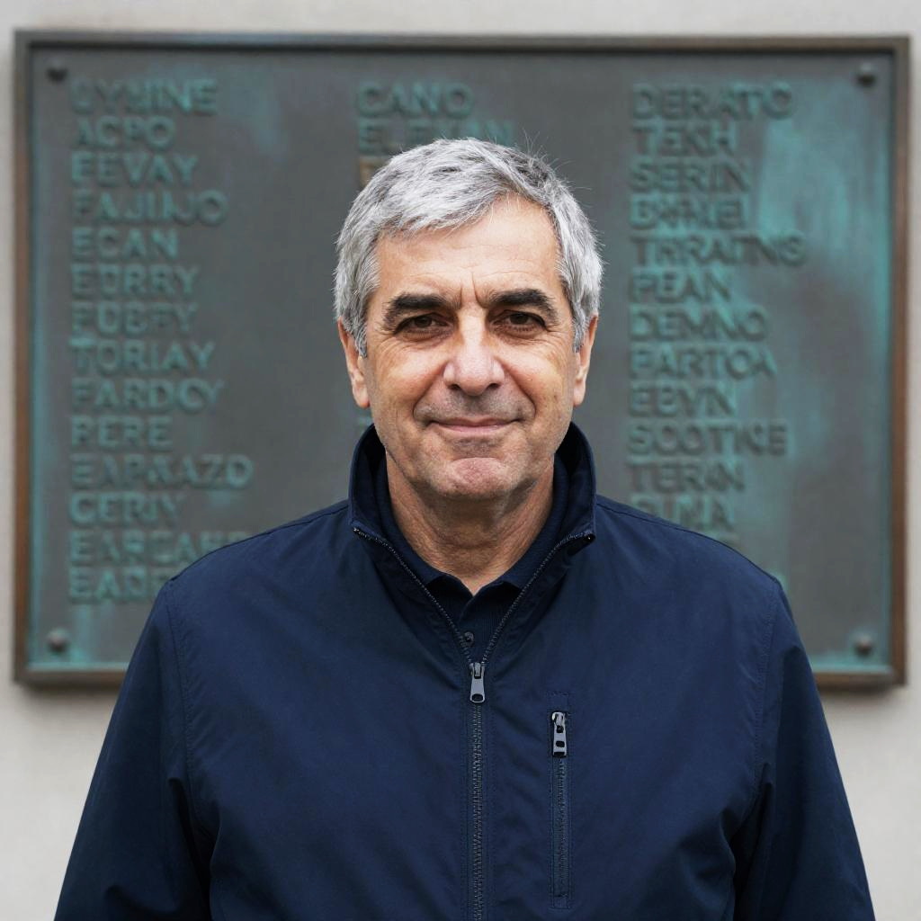Photograph of an older man with grey hair, wearing a dark suit, white shirt, and black tie with red and white stripes. He has a serious expression, slight frown, and wrinkles on his face. Background is blurred.
