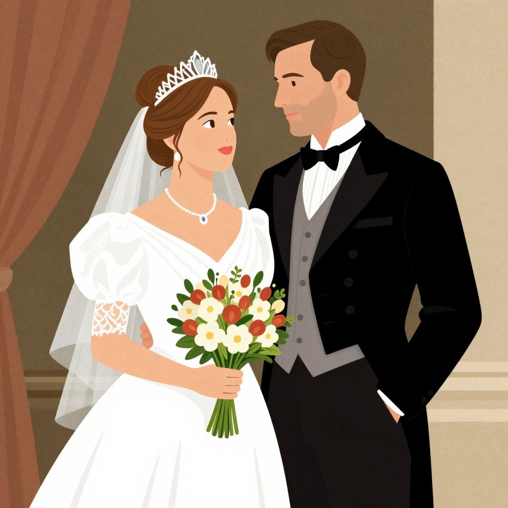 Digital illustration of a bride in a white dress and tiara, holding a bouquet, and a groom in a black tuxedo, standing close,