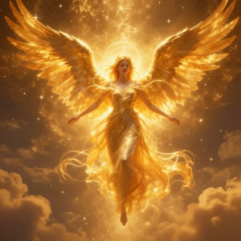 Digital artwork of a radiant, golden-winged angel with flowing, fiery dress, surrounded by bright flames and glowing clouds, floating in a starry sky