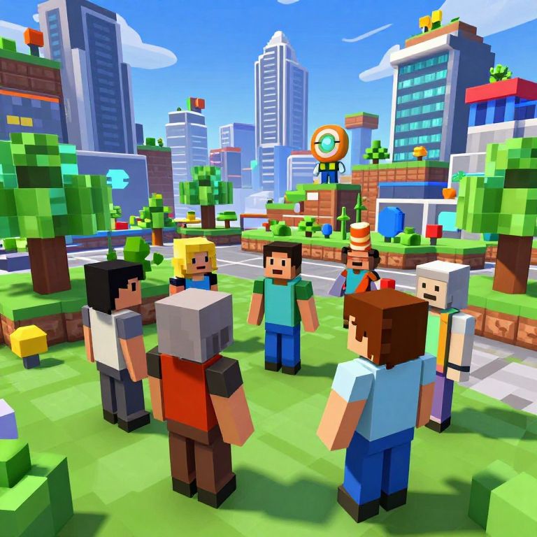Roblox virtual world scene with colorful blocky characters interacting in a lively digital cityscape, bright skies, pixelated trees, futuristic buildings, dynamic lighting, and playful atmosphere, high detail, vibrant colors, immersive gaming environment.