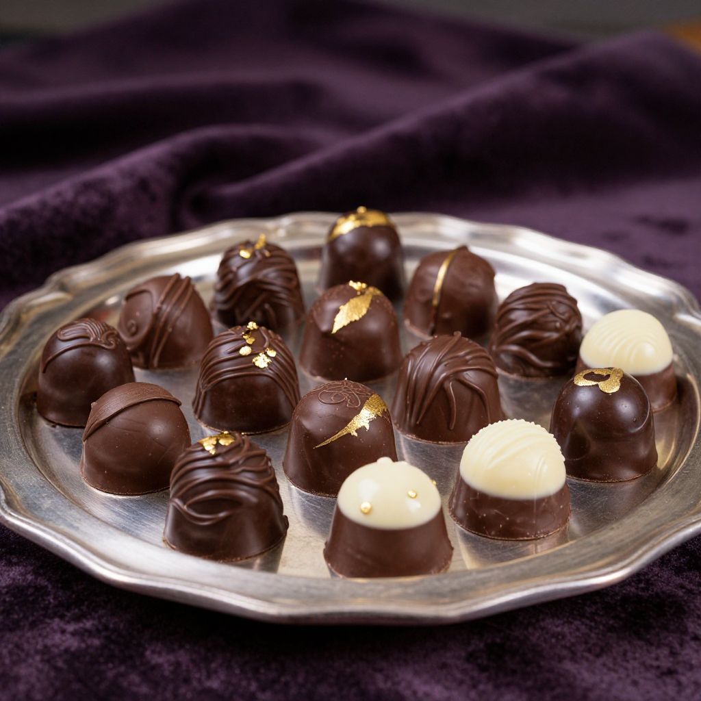 Godiva chocolate truffles arranged elegantly on a vintage silver platter, rich dark and milk chocolates with intricate gold leaf accents, soft ambient lighting highlighting glossy textures, luxurious setting with velvet and silk fabric draped in the background