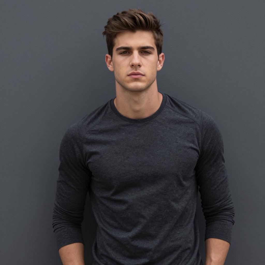 Gray shirt costume, photorealistic portrait, young white man, brown hair, short hair, wearing grey plaid button-up shirt, single button unbuttoned, pocket on left chest, serious expression, standing in outdoor setting, sunlight, blurred neutral background, daytime, casual clothing, upper body shot, realistic ures, detailed shading, natural light, photograph style, slight shadow under jawline, relaxed posture, mid-20s, light skin tone, clean-shaven, slight wind in hair, sharp focus on face and shirt