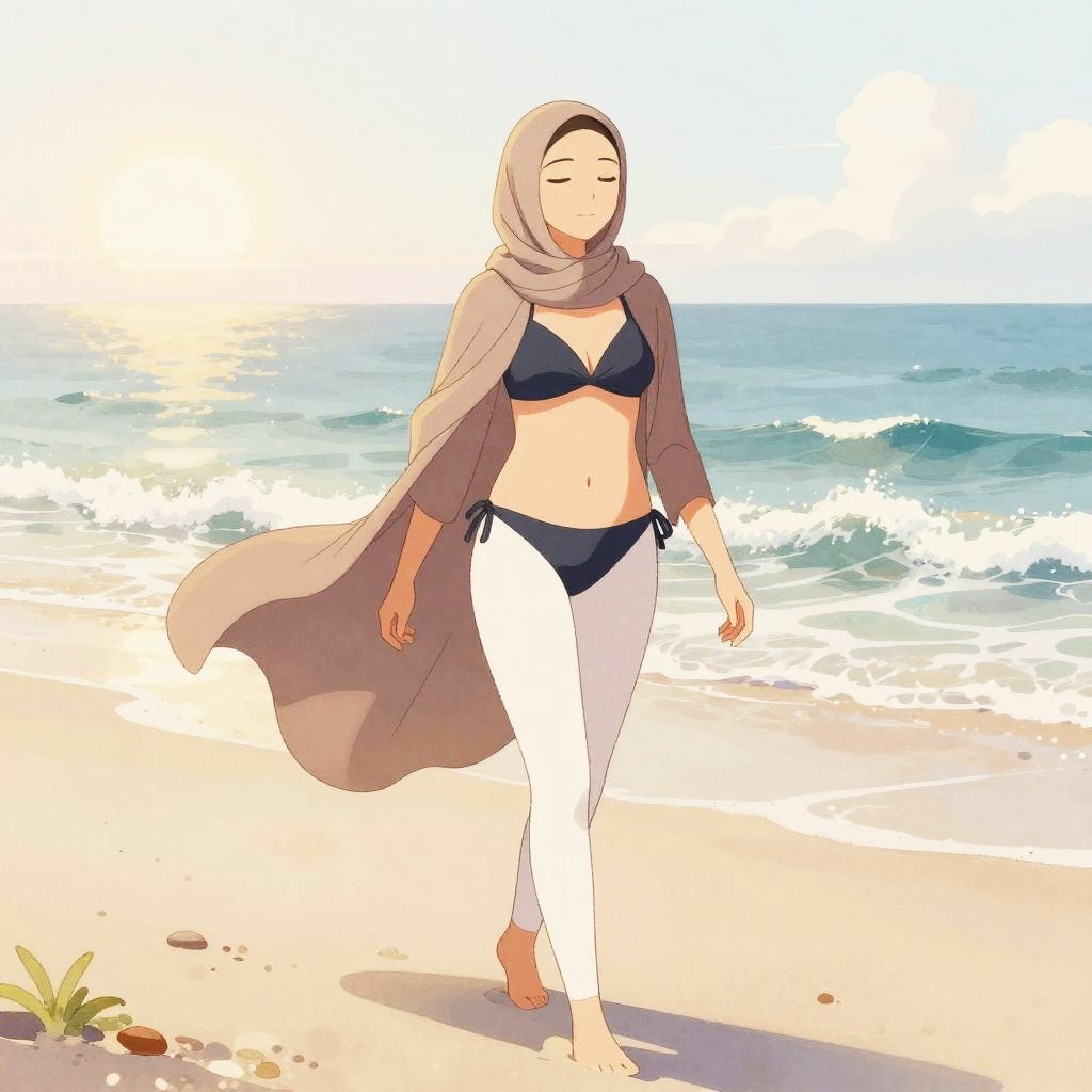 Artistic illustration of a hijabi bikini on a serene beach, soft watercolor style, flowing fabrics and gentle waves, calm and peaceful mood, warm sunrise lighting with natural elements
