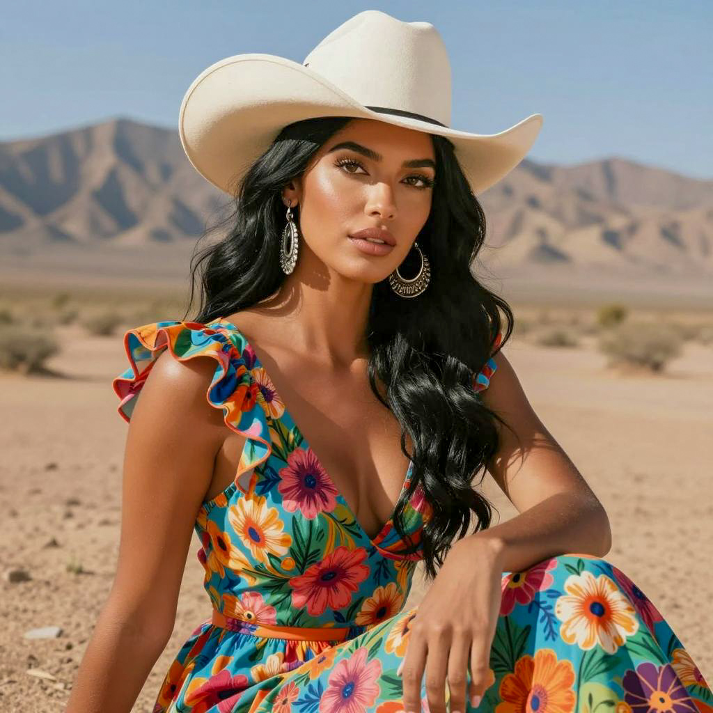 Photograph of a woman with tan skin and dark hair, wearing a black long-sleeve dress with a square neckline and a wide-brimmed beige hat. She stands against a sunlit stone wall, casting a shadow of herself. Her right hand rests on the wall, and her left hand adjusts the hat. She has a slightly open mouth and a confident expression. The sun casts strong shadows, highlighting the ure of the stone wall. The woman's pose is relaxed with a slight tilt of her head.