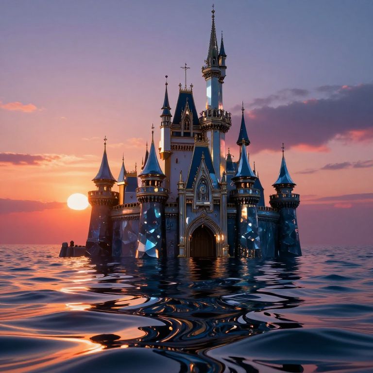 Photograph of a majestic, illuminated castle with multiple pointed towers and a central spire, partially submerged in a reflective, rippling water surface. The castle has a medieval Gothic style with detailed architecture. The sunset in the background is a gradient of warm oranges, pinks, and purples, casting a glowing reflection on the water. The sky has scattered clouds, adding texture to the scene. The water's surface is smooth with gentle waves, mirroring the castle and sunset. The overall atmosphere is magical and serene.