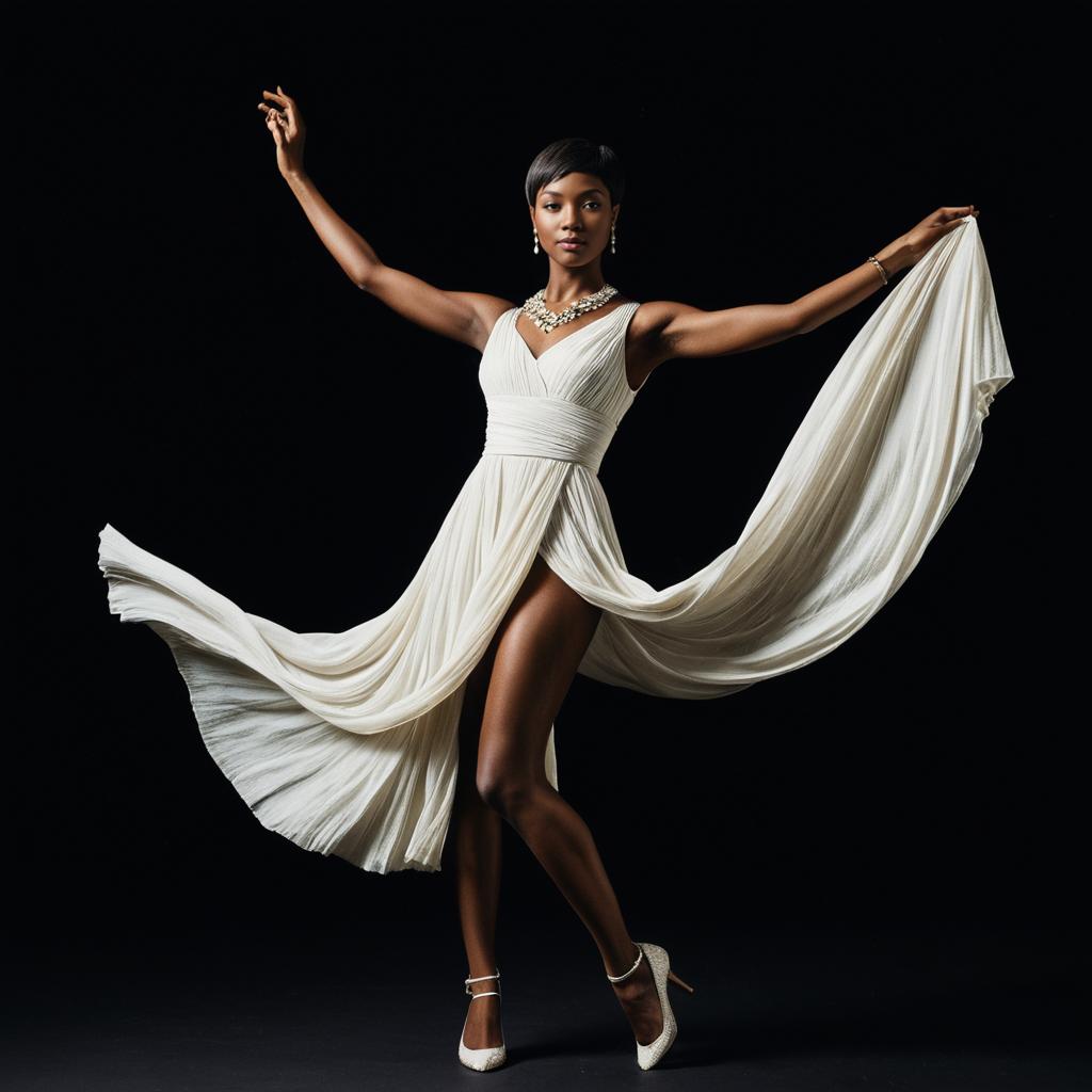 Graceful black woman with deep bronze skin and short sleek alabaster pixie cut poses in an elegant flowing white dress with intricate gold detailing. She rises on tiptoes with one arm extended overhead and the other holding the flowing fabric of her dress, set against a black background. The woman wears delicate luminous jewelry including a necklace and bracelet, exuding serenity and poise.