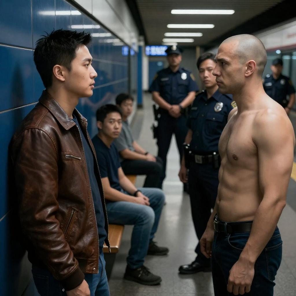 Photograph of two men in a dimly lit, industrial setting. The man on the left has curly black hair, a white tank top, and tattoos on his arm. He gently touches the head of the bald man on the right, who is wearing a harness with metal chains. The bald man has a serious expression. The background includes blue and red electronic displays.