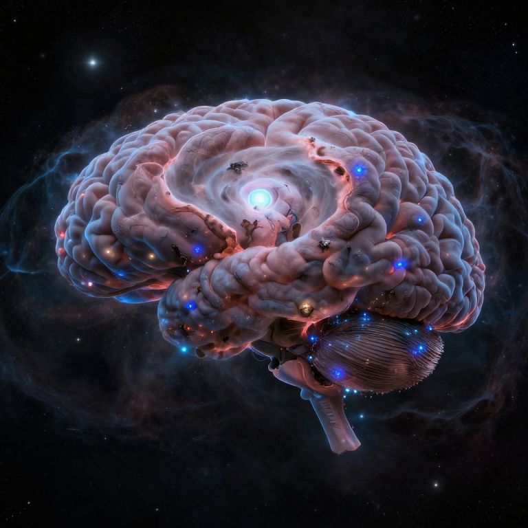Digital CGI of a glowing, intricately detailed brain floating in space, surrounded by blue and pink lights, with cosmic background.