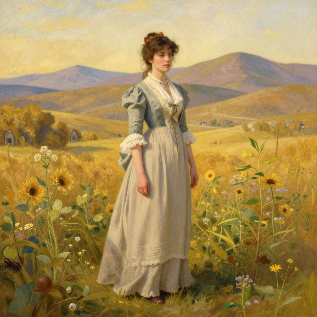 A serene digital artwork inspired by Edmund Leighton's style, featuring a woman in period attire standing amidst a lush, golden landscape with distant mountains, rendered in high-definition detail and evoking a vintage, romantic atmosphere.