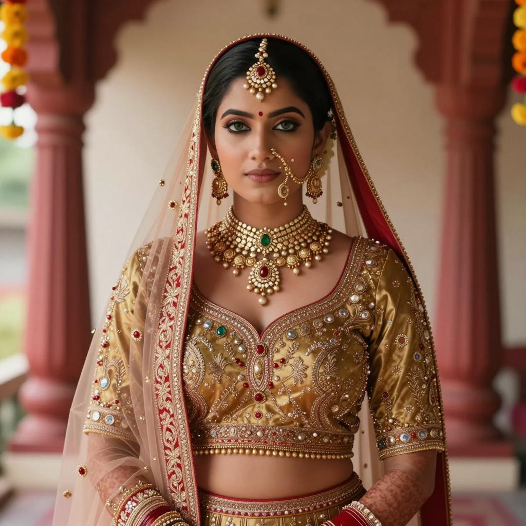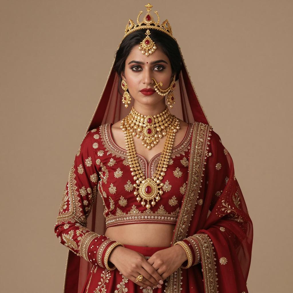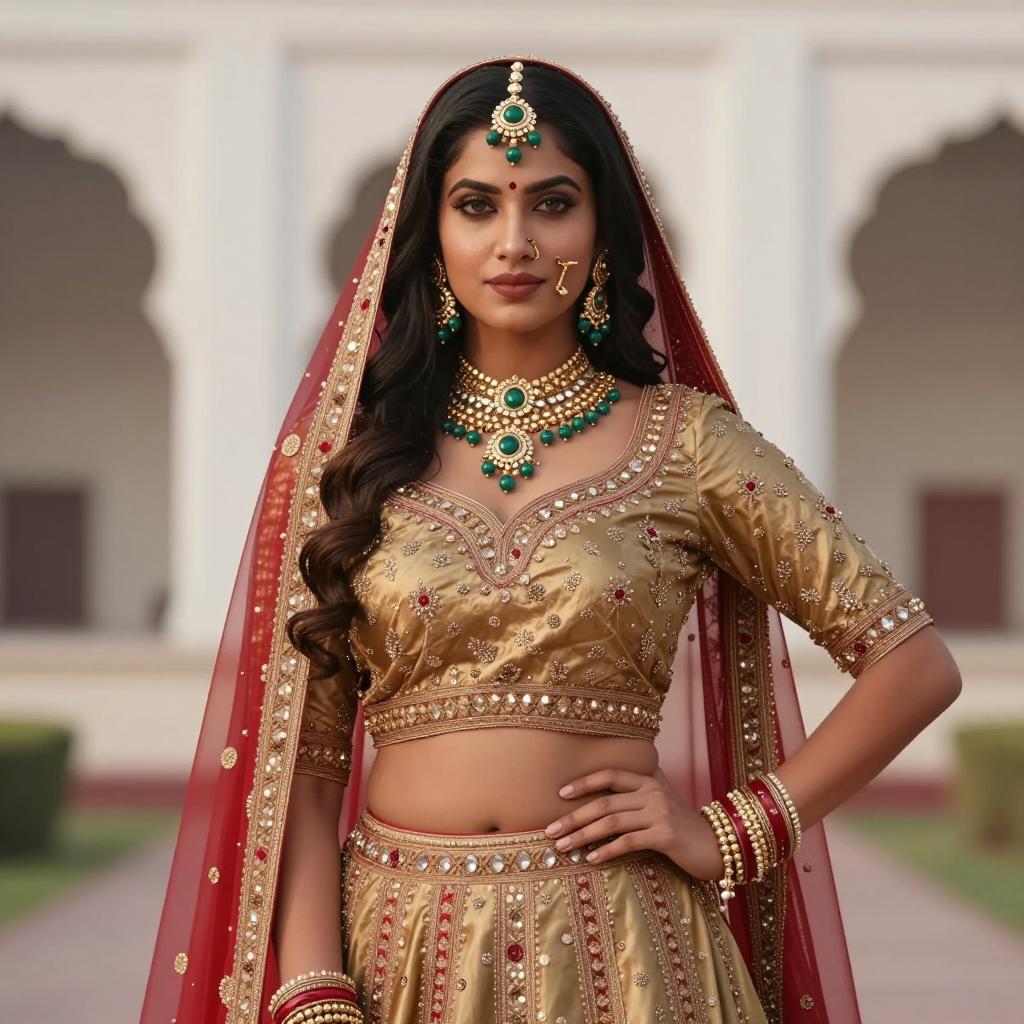 Full-body photograph of an elegant Indian woman standing confidently on a street during daytime. She wears a traditional Indian outfit featuring an ornate gold and pink lehenga with intricate embroidery and sheer white puffed sleeves. Her long black hair is styled in a thick braid adorned with a crown, complemented by gold jewelry including earrings, bangles, a choker necklace, and rings. The background is blurred, showing people and buildings in soft warm lighting.