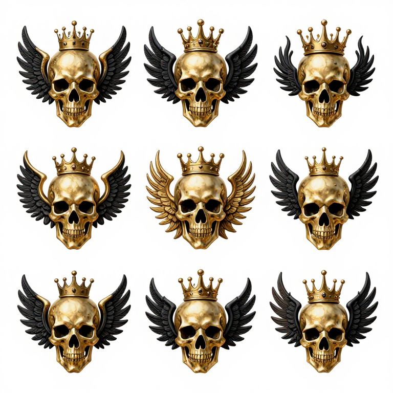 A collection of intricate gold and black emblems featuring skulls, wings, crowns, and flames, evoking a devilish and mystical atmosphere.