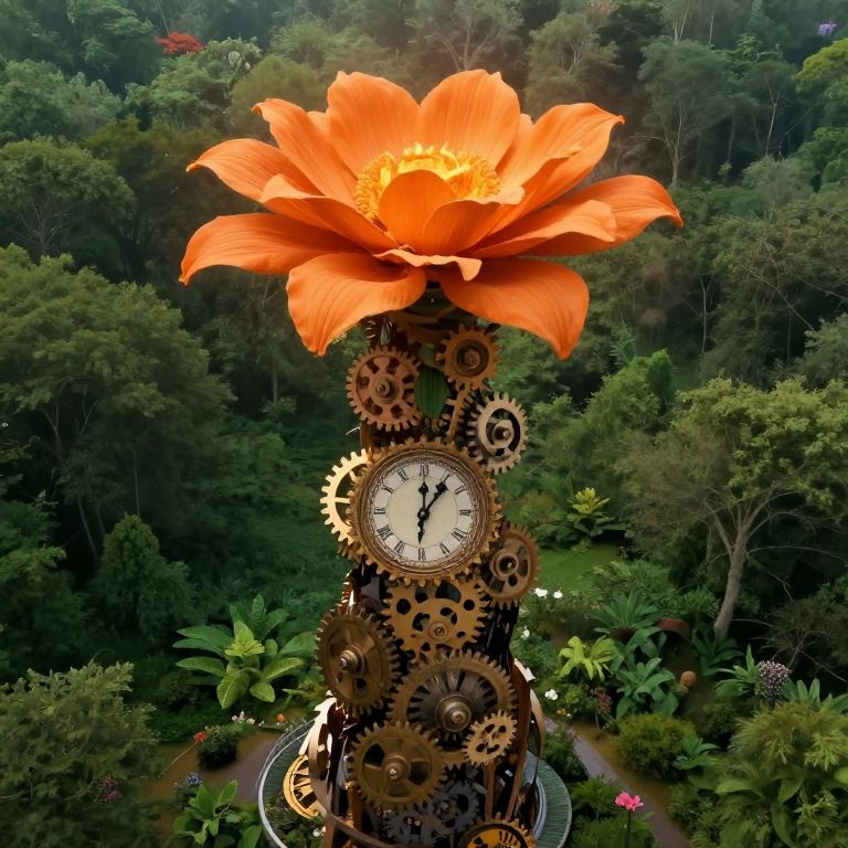 Gears and petals intertwine in a mystical forest, where a towering clockwork structure spirals upward, its top blooming into a radiant orange flower that casts a magical glow over the surrounding verdant landscape.