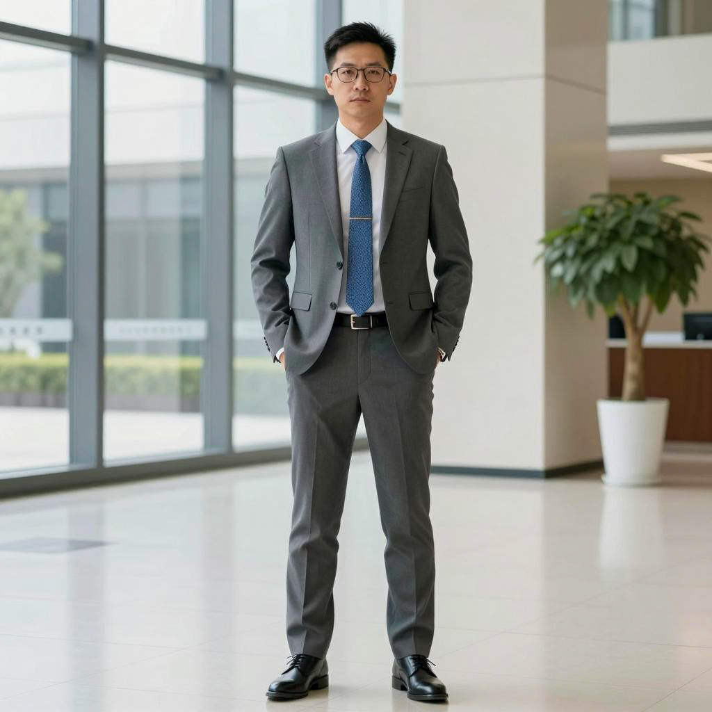 Two men in suits standing indoors. Left man with glasses, blue suit, black tie, hands clasped. Right man with dark suit, white shirt, red tie, holding brown envelope. Right man's serious expression. Background: dimly lit room with shelves and door. Both men looking forward. Number of people: 2.
