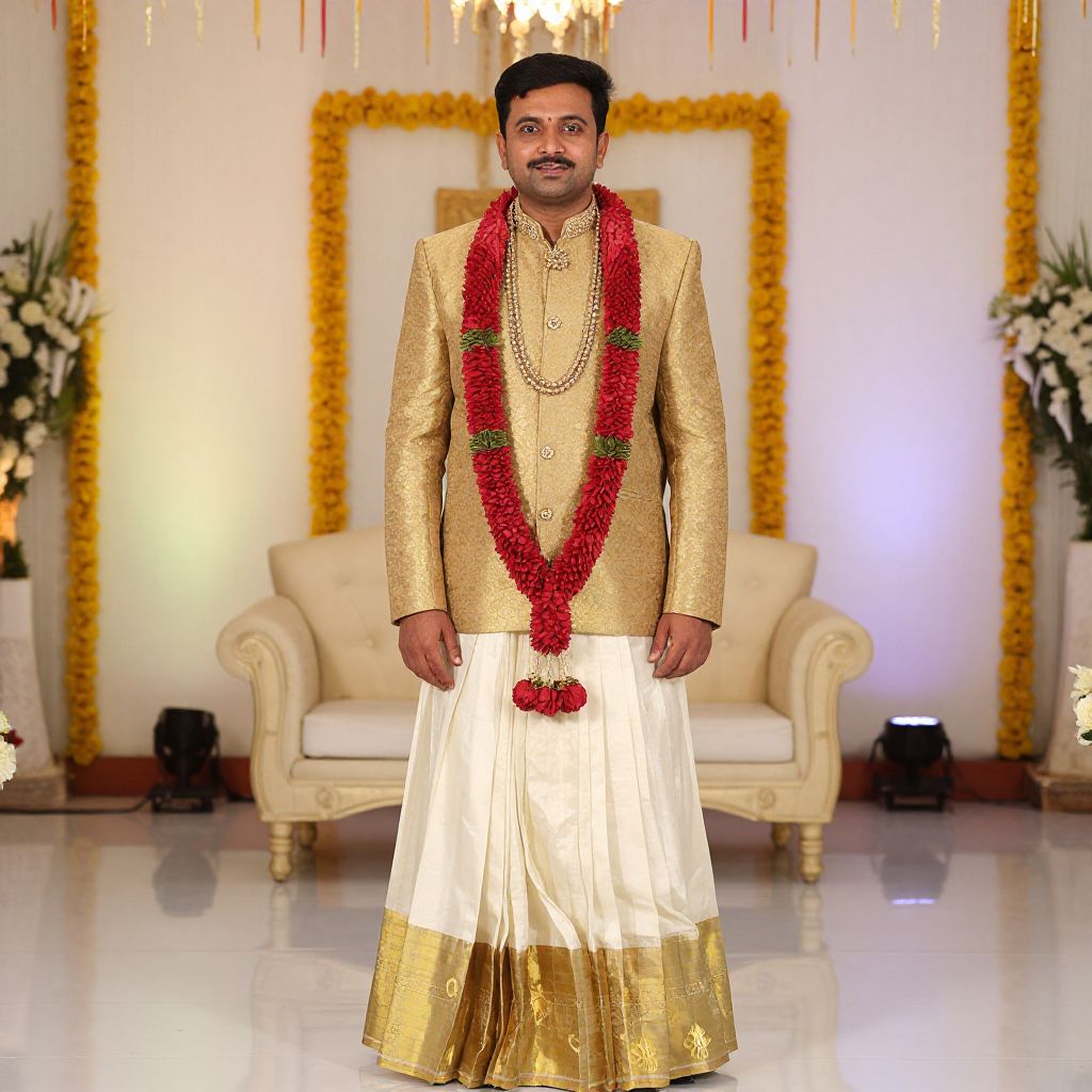 Photograph of a South Asian man standing in a traditional wedding setting. He has a medium build, short black hair, and a trimmed beard. He is wearing a gold embroidered long-sleeve shirt with a white pleated dhoti, adorned with a red and green garland around his neck and a red dot on his chest. The background features a white wall with a gold-framed picture, white armchairs, and floral arrangements. The floor is reflective, and there are small decorative lights above. The man looks directly at the camera, smiling.