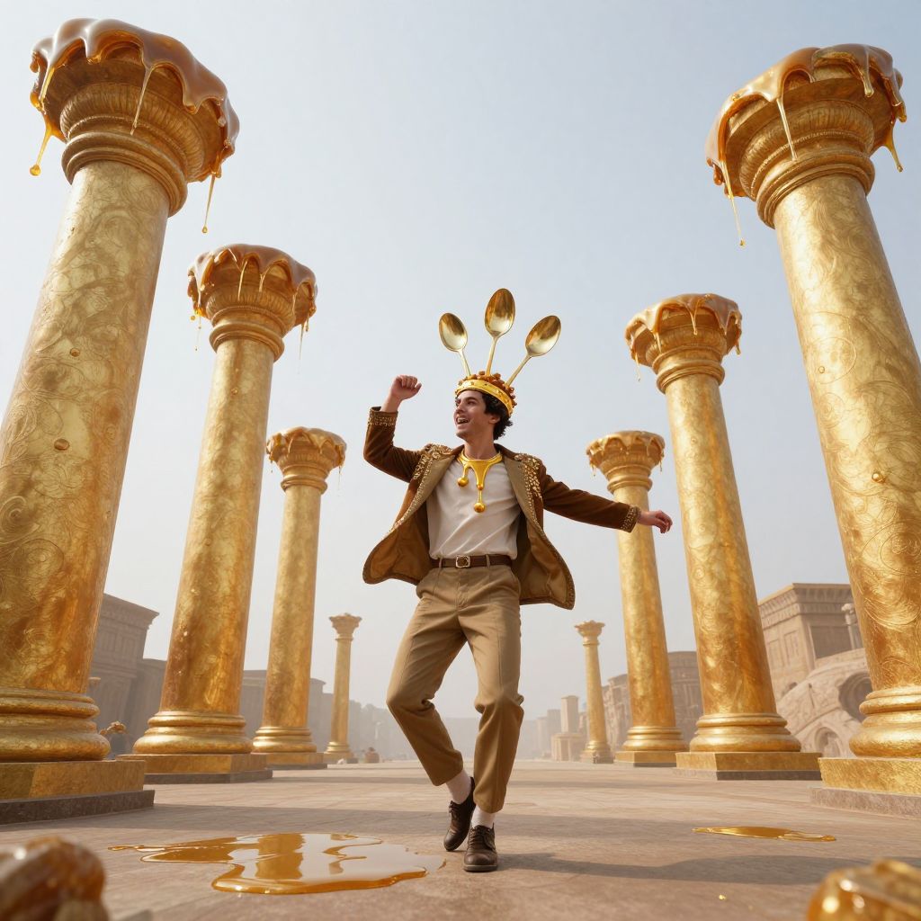Man dancing joyfully beneath a surreal landscape of golden pillars, each crowned with a cascade of honey-like liquid defying gravity, while wearing a whimsical headdress crafted from melting spoons.