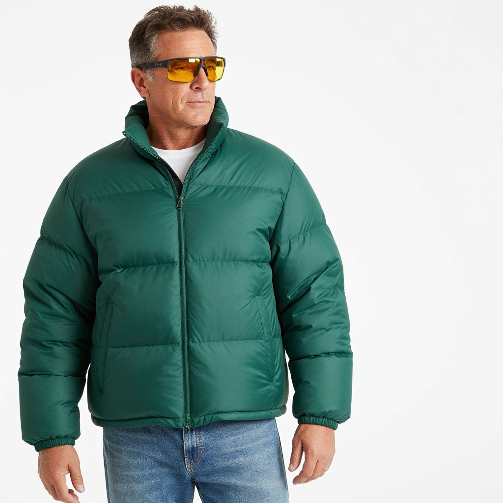 Beach middle aged man in green puff jacket, yellow shiny Oakley shades, denim jeans, white background,