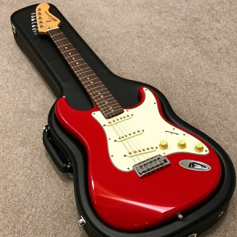 Translucent red 2004 Fender '68 RI MIJ Zebrawood Stratocaster electric guitar resting on a black hardshell case, featuring cream pickguard, three gold knobs, and six strings with zebrawood fretboard, displayed against a neutral carpeted background.