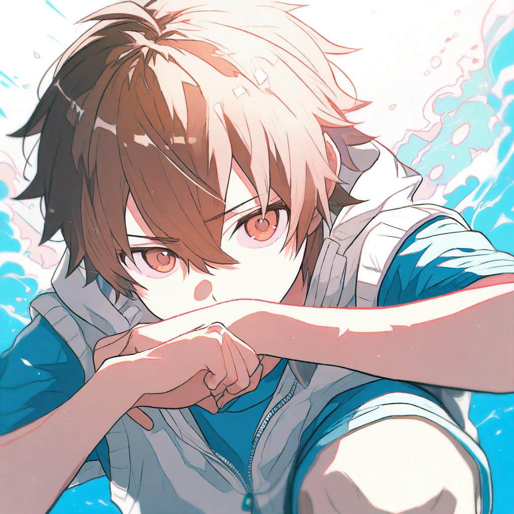 Digital anime-style illustration of a young boy with short brown hair and brown eyes. He is wearing a blue t-shirt under a white sleeveless hoodie with the hood down. The boy has two bandages on his left cheek and rests his chin on his right hand. The background features light blue water-like swirls.