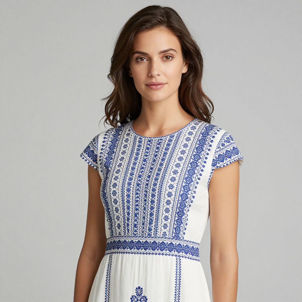 Woman with long brown hair wearing a white dress with red designs and a brown belt.
