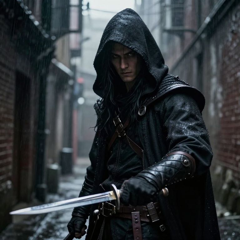 Long black hair characters male, rogue assassin in hooded cloak blending into shadowy alley, daggers in hand, piercing eyes, gritty urban environment with rain and fog, dramatic chiaroscuro lighting, detailed textures and moody color palette.