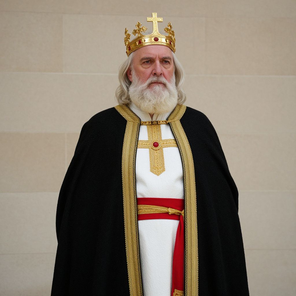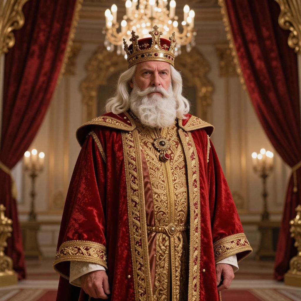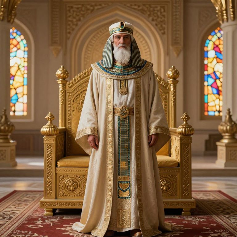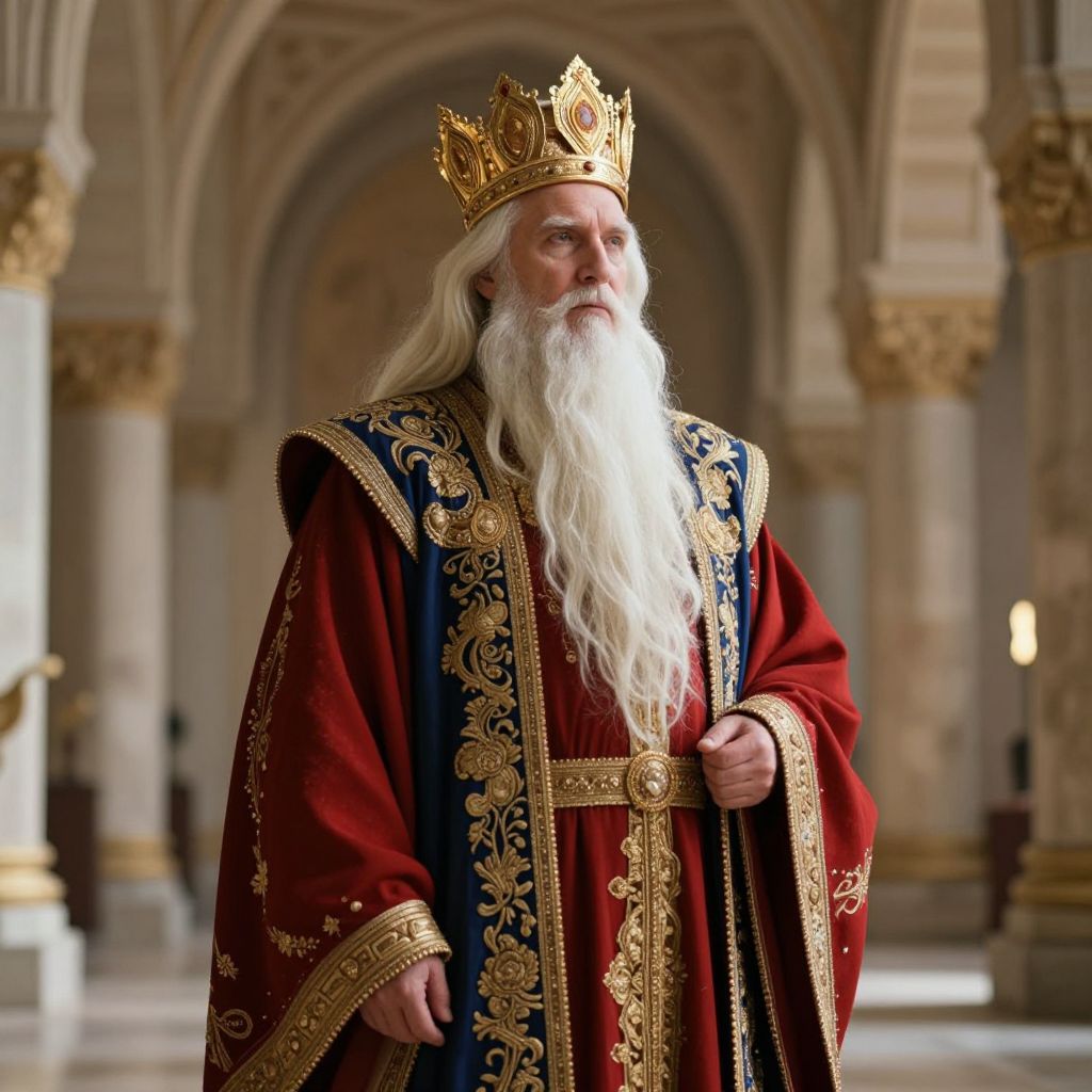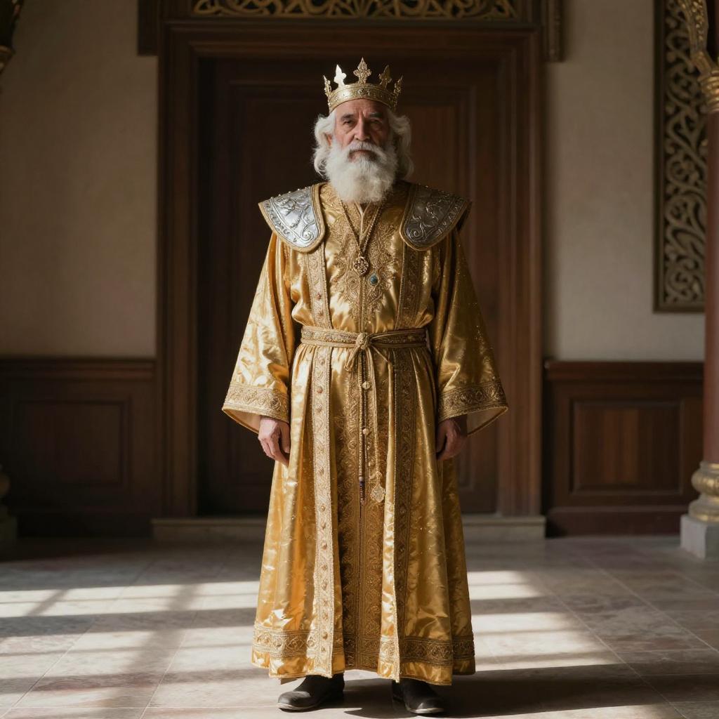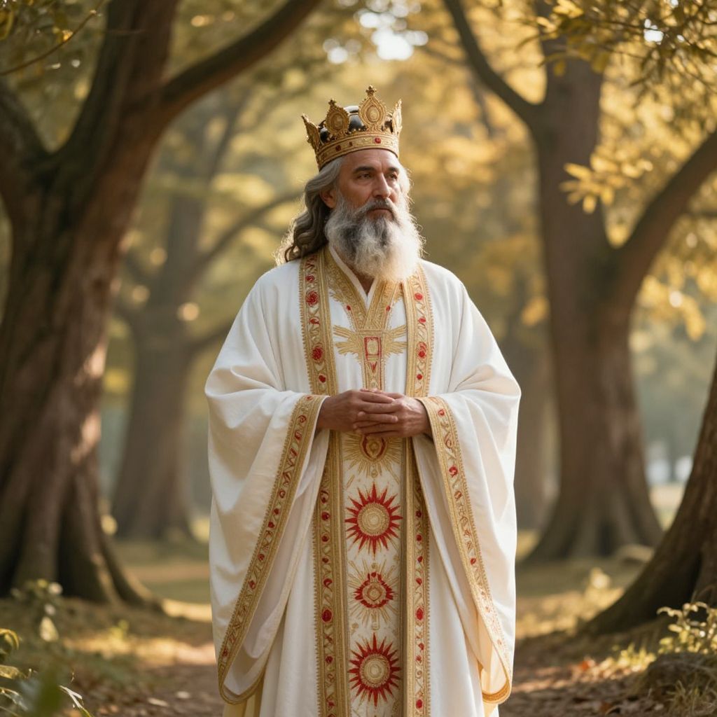 A wise and dignified man with a full, well-groomed beard and a royal crown resting gently on his head, exuding calm authority and deep spiritual insight. He wears a long, flowing white robe intricately embroidered with radiant red and gold patterns along the front, symbolizing divine wisdom, royal power, and eternal knowledge. The scene unfolds in a serene, majestic landscape of ancient, towering trees with broad canopies, their leaves gently swaying in a soft breeze. Warm golden light filters through the trees, casting dappled shadows and creating a peaceful, ethereal atmosphere. The overall composition radiates timeless power, spiritual grace, and a sense of profound wisdom, as if the man embodies the harmony between nature and the divine.